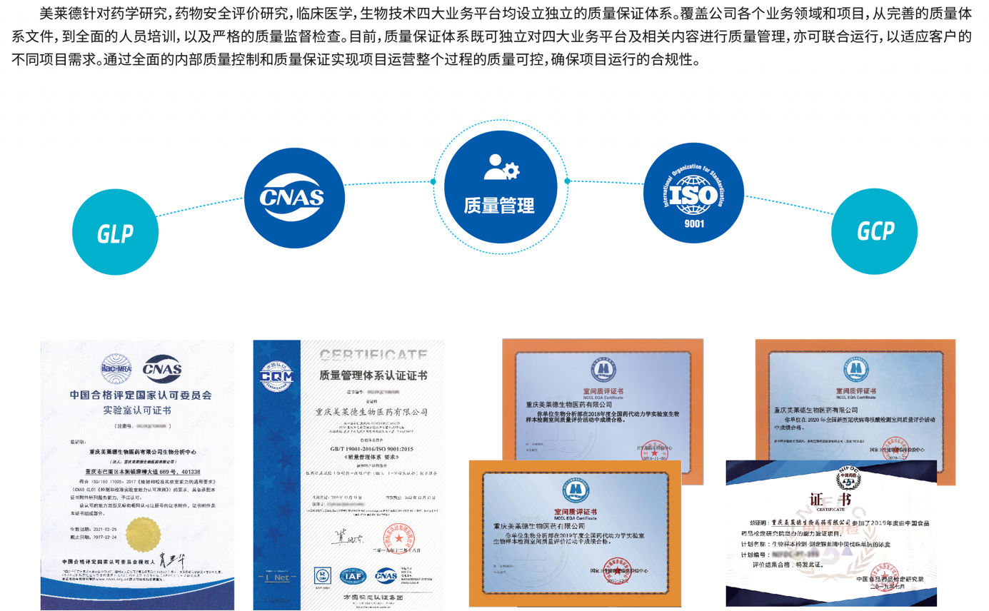 Medleader has established an independent quality assurance system for the four major business platforms of pharmaceutical research, drug safety evaluation research, clinical medicine, and biotechnology. Covering the company's various business areas and projects, from complete quality system documents, to comprehensive personnel training, and strict quality supervision and inspection. At present, the quality assurance system can not only independently perform quality management on the four major business platforms and related content, but also operate jointly to meet the needs of different projects of customers. Through comprehensive internal quality control and quality assurance, the quality of the entire process of project operation is controllable and the compliance of project operation is ensured.